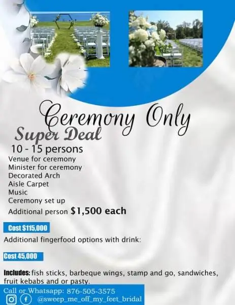 Getting married? On a budget? Say no further. Bridal gown included but if you already have your gown we can add photo and video services. Give us a call or wats app 876 505-3575.